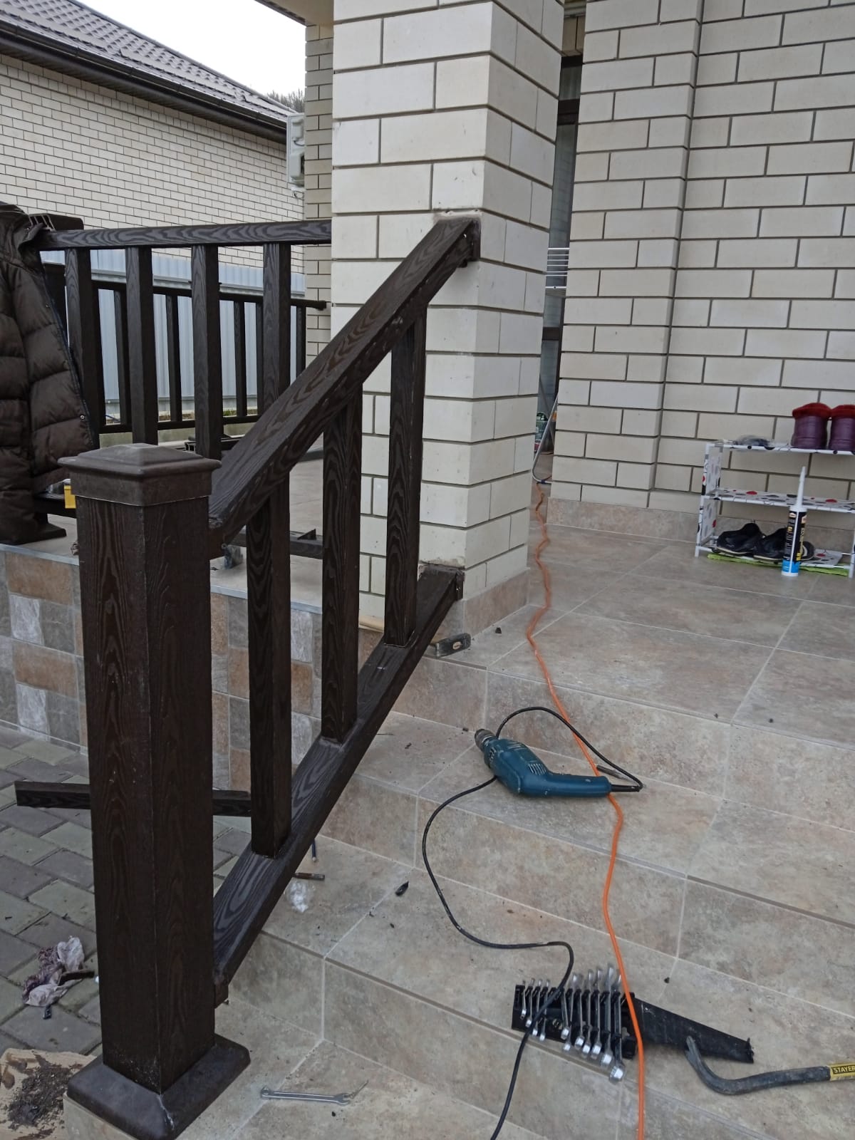 Перила пришлось пилить под углом и крепить без хомутов-креплений, так как клиент отказался покупать дорогие алюминиевые хомуты с шарнирами